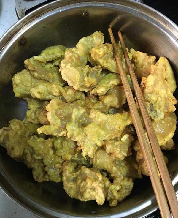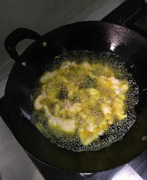 第三步:倒入適量的油,燒制80度左右,就可以下鍋炸瞭,炸至兩面金黃色,即可出鍋瞭。不過炸的過程得註意不要讓裹好的蛋液的肉片黏在一起,這樣肉不容易炸熟。