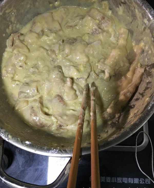 第二步:加入適量的淀粉,雞蛋液調勻,盡量使每片肉都均勻的裹上蛋液。
