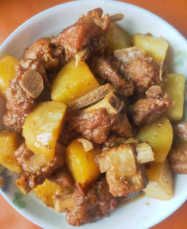 食材:小排骨兩根,大土豆一個,料酒一勺,白糖半勺,生抽兩勺,蠔油一勺,十三香一勺,胡椒粉半勺,薑片少許,鹽半勺,食用油少許。