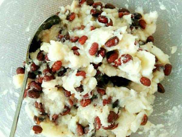 5.將炒好的紅豆倒入山藥泥中,攪拌均勻,即可倒入可愛的模具中,就大功告成啦!