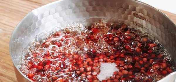 4.紅豆撈出備用,在鍋中加入8g細砂糖,100ml清水,中火不停攪拌熬成粘稠狀,倒入紅豆,不斷翻炒過上糖漿。