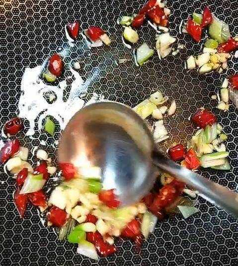 2、鍋裡放油,放入蔥蒜,辣椒爆香。