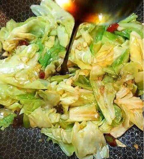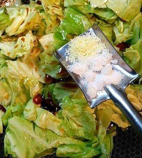 3、放入包菜,耗油,生抽,鹽、白糖、雞精。4、