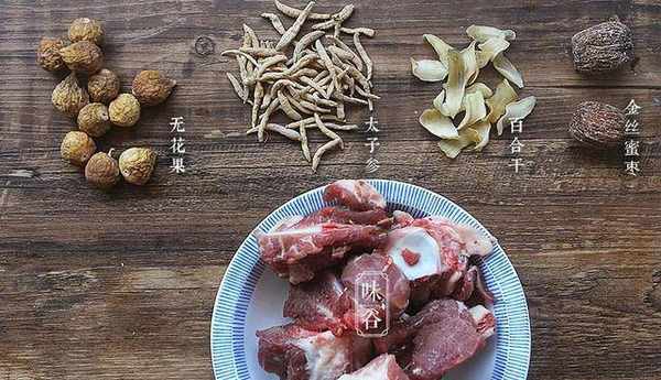 【材料】:豬扇骨 600克、太子參 10克、無花果11顆、幹百合 10克、蜜棗 2顆、薑 2片、鹽 適量、