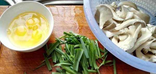 2.姬菇洗凈,用手掰小,雞蛋打入碗中,蒜葉洗凈,切段