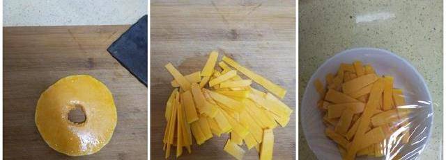 制作過程:1.準備好南瓜,洗幹凈後去皮去籽,切成薄薄的南瓜片。