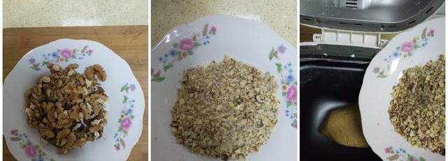 9.當和面程序剩餘3—5分鐘的時候,將核桃碎倒進去。程序結束後,核桃碎也均勻的攪拌進面團裡瞭,室溫進行一發。