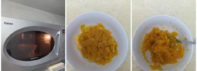 2.南瓜片放入碗中,蓋一層保鮮膜,放入微波爐中,高火叮2分鐘。(南瓜切得薄一點,熟得快,也可以用蒸鍋蒸熟。)