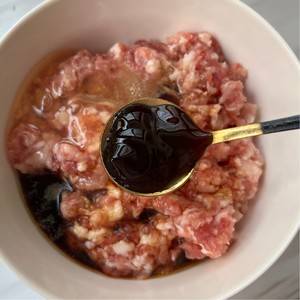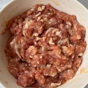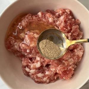 第一步:豬肉絞成肉餡,在碗裡加入一個蛋清、加適量白胡椒粉、加一勺生抽調味、一勺料酒去腥、一勺蠔油提鮮、攪勻醃制半小時讓其入味。