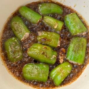 第四步:冷鍋下油,油燒熱後,放入肉沫面朝下煎,小火慢煎,一面煎出虎皮,然後翻面再煎,註意不要煎焦瞭。表面煎出虎皮後,加入醬汁煮沸,至尖椒釀熟透。收汁後就可以盛起來裝盤瞭。