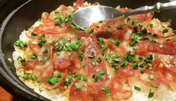 【食材】:臘腸、大米、香蔥、醬油、生抽、耗油、芝麻油、香油、細砂糖。