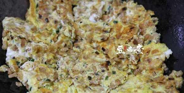 5、然後打開蔬菜的胸,把雞蛋液灑在蔬菜的胸上,稍微烤一下後,切成小塊翻面,兩面烤焦成金黃色後取出鍋。