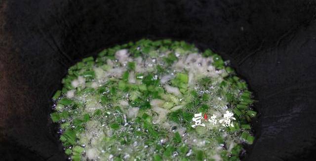 3、將適量的油倒入鍋中加熱,油溫上升至70%,放入青蔥搗碎,使其散發香味,爆香的時候,註意火候不要烤焦瞭。