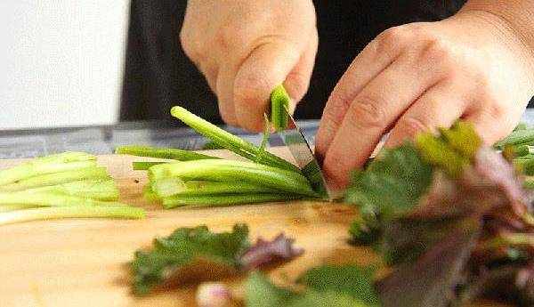 2、然後加入沒過紫蘇葉的清水,下手給它清洗一下,洗幹凈之後,控水撈出來,放到砧板上,切成小段,裝到碗裡備用。