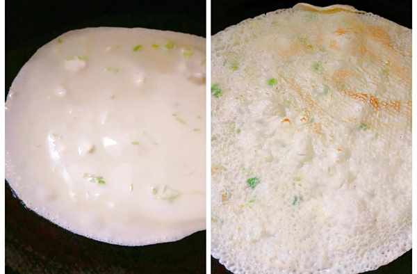 3,舀入一勺面糊,迅速轉動鍋,使面糊均勻佈滿鍋底,改小火,待餅表面鼓起泡翻面烙幾秒鐘即可出鍋。