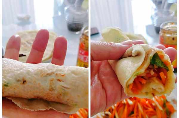 5,這種餅卷上涼菜,配稀飯,很適合夏季,特別是三伏天,清涼解暑,而且做起來也特別簡單,一張餅耗時半分鐘,卷涼拌土豆絲、涼拌豆芽、涼拌胡蘿卜絲都不錯。