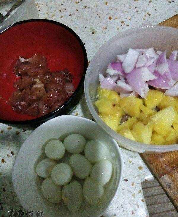 1.瘦肉切小塊提前10分鐘放點生抽醃制,蛋煮好去殼,菠蘿洋蔥切塊。