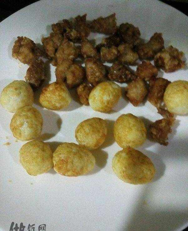 2.油燒開,肉抓一下淀粉先炸一會,再放入蛋一起炸。
