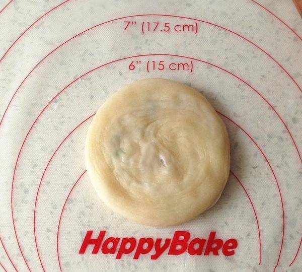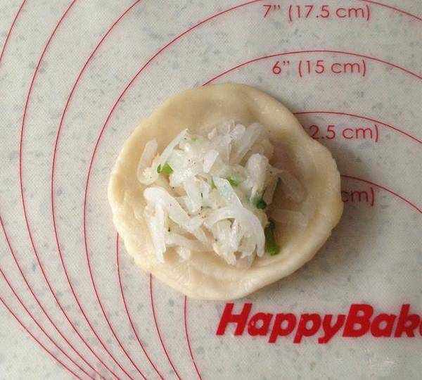 7.像包子一樣包住蘿卜絲餡,褶子面向下壓扁,搟成大小合適的圓形。