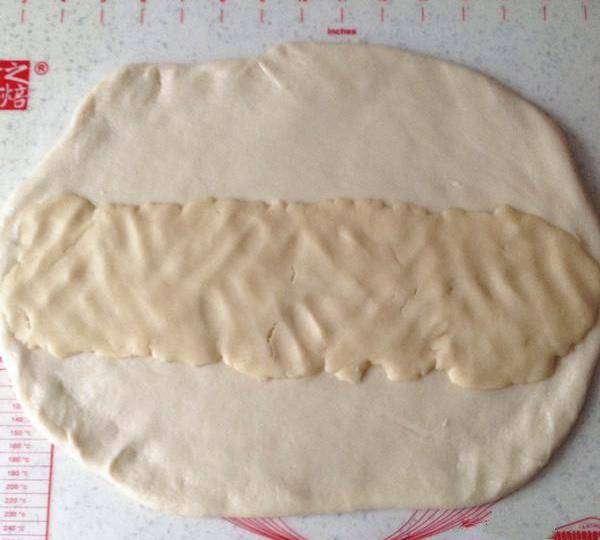 3.先把餳好的油皮面團搟成大長方型,油酥均勻擺放在油皮中間。