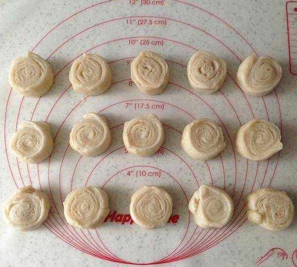 5.第二次搟好的薄片從一邊卷起,均勻切分16份,全部蓋上保鮮膜餳10分鐘。
