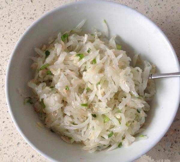 2.蘿卜擦成細絲後先用鹽醃,再氽水控幹,蔥洗凈切成蔥花,蝦皮洗泡擠掉水份,撒上適量鹽、2大勺亞麻籽油混合拌勻即為蘿卜絲餡。