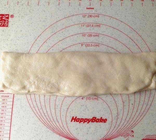 4.把油皮分別從兩邊往中間折疊,包住油酥再搟成大長方型薄片。再一次重復上面折疊搟開。