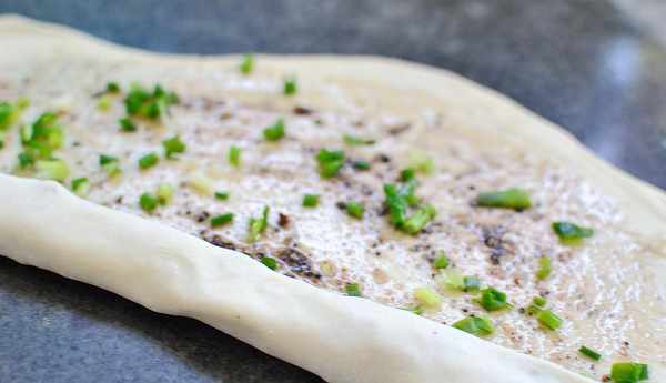 4、將松弛好的面團搟成薄片,盡量要薄,能多薄你就搟多薄,然後刷上一層椒鹽油,撒上適量的香蔥,不要太厚香蔥,隨意撒開,然後從一端將面皮卷起來,捏緊。
