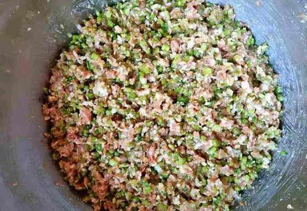 3.肉餡裡加入勺料酒、食鹽、五香粉、薑末、香油、生抽、老抽,攪拌均勻,醃制一會。把蒜苔攪拌進去。
