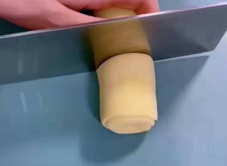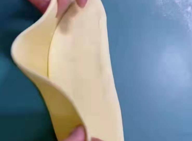 6.再次搟薄,搟長,再從一側給它卷起來,中間一分為二,(這步很重要,是起酥的關鍵,)