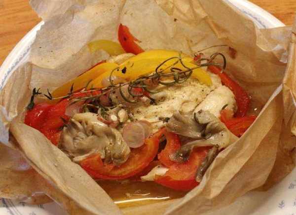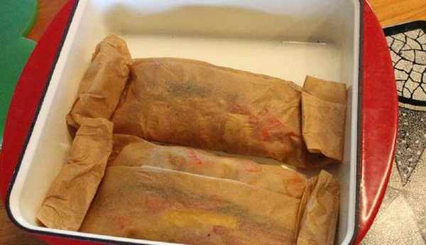 Step4.將烤盤紙兩邊拉起對折,一直往下細條對折,再將烤盤紙兩側邊一直小對折,將折好的紙包魚,放入烤盤。