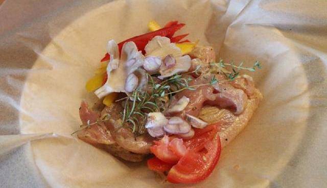 Step2.將雞胸肉放置大張烤盤紙上,上面擺上菇類(本想用生香菇,沒買到)、蕃茄、甜椒、紅蔥頭、迷迭香、百裡香。其實配菜隨性,像櫛瓜、洋蔥也都可以。沒有新鮮香草,撒上幹燥意大利香料也可以。