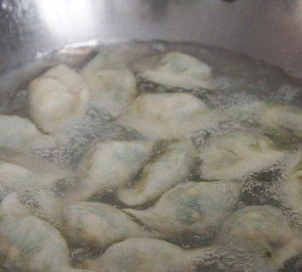 第7步、煮餃子:鍋中加入適量多的水,水開後下入餃子,翻開後點入冷水,第二次翻開再點入冷水,第三次翻開即可出鍋,餃子煮的恰到好處。