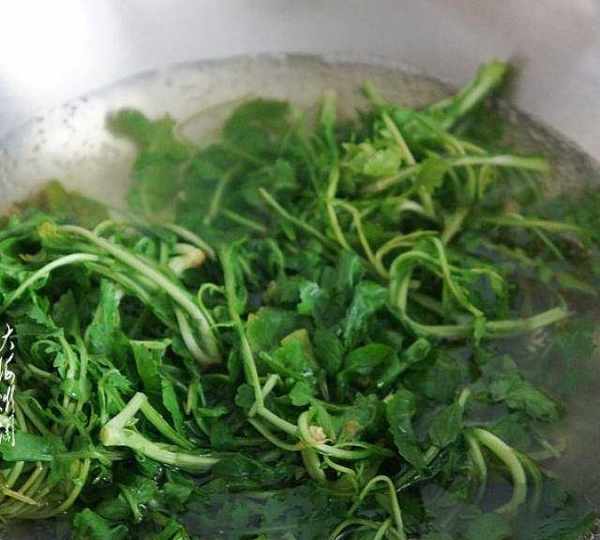 第2步、新鮮的薺菜摘洗幹凈,野菜沒有污染,冷水浸泡一會再清洗幹凈即可,鍋中加入適量的水,水開加一勺鹽,然後下入薺菜焯水,變色後即可撈出過冷水,切碎攥掉水分。