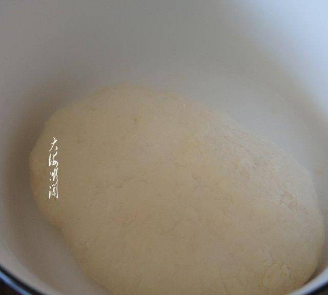 第1步、面粉加入適量的水和成面團,蓋上保鮮膜餳著。如果早餐吃水餃,最好前一天晚上就和好面餳著,第二天早上特別好用,傢裡溫度高可以冰箱冷藏。