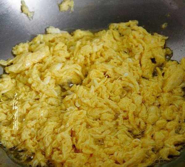 第4步、炒鍋加入適量的油,油開加入蛋液,迅速用筷子攪拌,越碎越好。然後出鍋,晾涼備用。