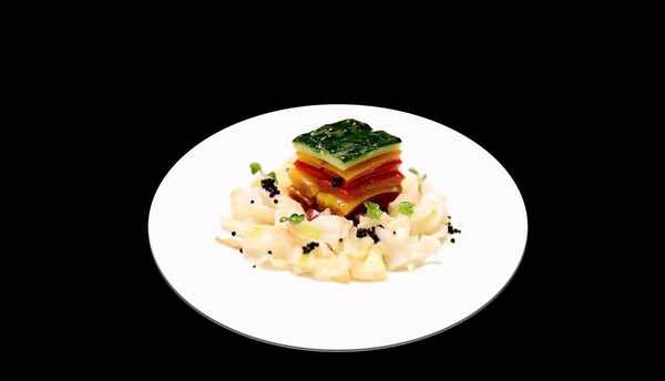 把浸泡入味的食材取出如圖擺盤,白木耳提前浸泡漲發後用雞汁和調料燒入味,擺在食材的周邊,再用黑醋魚籽點綴,撒入蔥花即可。