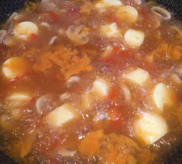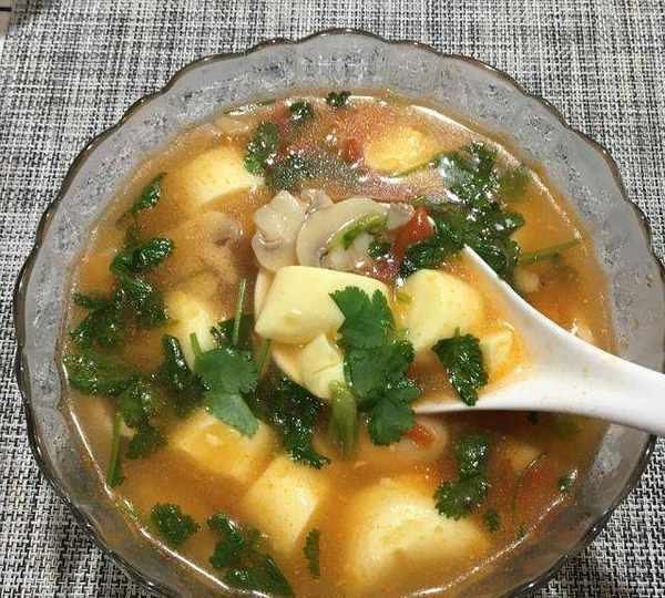 原料:日本豆腐、蘑菇、西紅柿、香菜、淀粉、稻米油、鹽、雞精、胡椒粉。