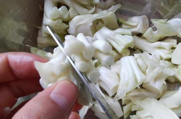 步驟二:菜花把菜梗和花朵直接分離,用刀切不用用剪刀直接剪掉來的快,一個大的花菜可以有不少的花梗部分,基本上就夠醃制一次的量瞭,當然如果需求量更大,也可以用兩個菜花。