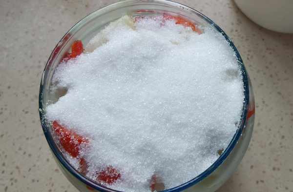步驟五:淹過食材之後把細砂糖非鋪在最上面,要厚厚的鋪上一層,也可以放一層菜梗鋪一層細砂糖。