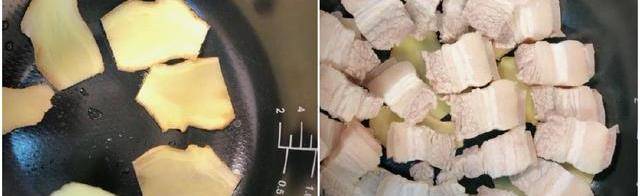 第四步:提前切點薑片,要大片大片的,然後再平底鍋底層均勻鋪上一層,再擺上我們沖洗好的五花肉