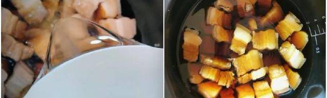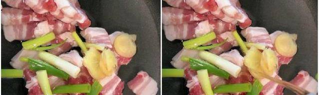 第二步:將切好的五花肉,涼水下鍋,再放入蔥段,薑片,再倒入少量的料酒,把肉煮出血沫撈出沖洗幹凈,就可以進行下一步操作瞭。