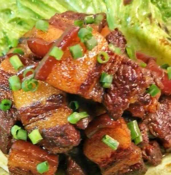 第六步:好瞭,鹵好的肉就是現在這個樣子瞭,放在炒鍋中收一下湯汁,因為是沒全程是沒有放鹽的,你也可順便嘗一下這個味道,如果不夠就再炒的時候加少許的食用鹽,如果咸味夠瞭,就不用再加瞭,湯汁收完就可以出鍋瞭。墊上一層生菜,裝上肉,撒上蔥花,絕對是一道大菜,一點也不為過。
