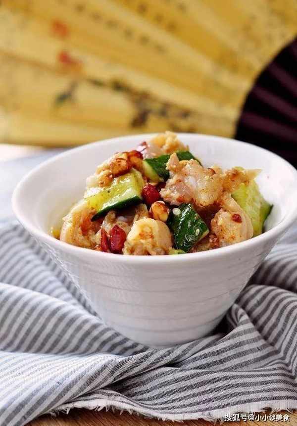 3.黃瓜切大塊,加入意大利香醋、芥末、糖、一茶匙咸醬油、辣椒油和花生碎拌勻。