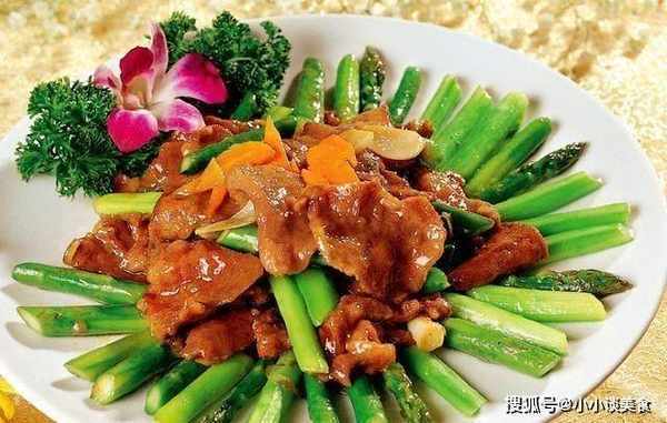1、蘆筍老根切去洗凈,馬蹄切段,鍋中燒開水,加入少許油和鹽,將蘆筍和馬蹄放入水中略煮,瀝幹。冷水待用;豬肉切片