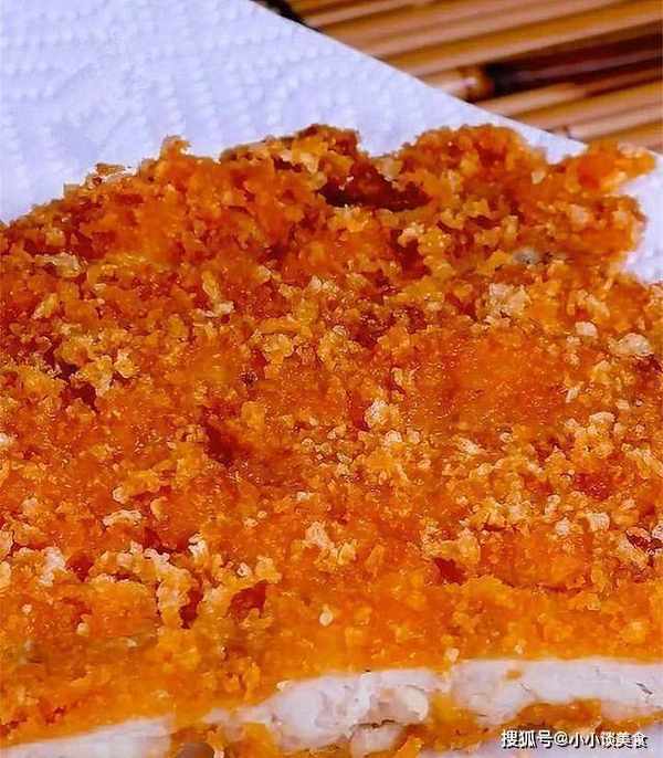 3、把醃好的肉放入淀粉中,翻動幾下,然後放入蛋液中,再加入黃色的面包屑。