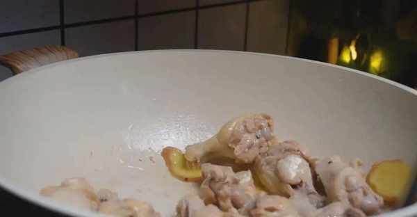 3、起鍋燒油,下入薑片,小火給它煸炒一下。煸炒過薑片的油會有薑的香味,非常的好吃,還能有效的去腥,然後把翅根給它加進來,用鏟子快速的給它翻炒一下,炒出翅根中的水汽。