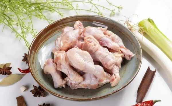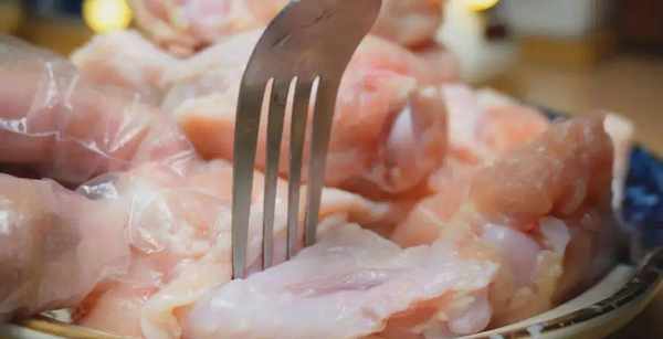 1、首先準備一盤新鮮的翅根,一定不要選那種凍翅根,那樣做出來的口感比較硬,沒有鮮翅根做出來口感那麼的嫩,用叉子在翅根上插上小洞,這樣方便翅根裡面的血水流出來,也方便後面烹飪的時候入味,這可是好吃的關鍵。