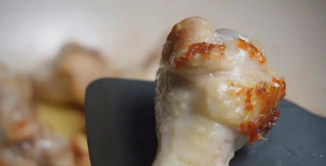 4、煸炒過的翅根,外皮會形成一層焦焦的皮,非常的好吃,煸炒去根的時候一定要用小火來煸炒,既可以把翅根的水分炒出來,又不會把翅根炒糊。大約炒上3~5分鐘炒到翅根外皮焦焦的,像這個樣子就可以瞭。