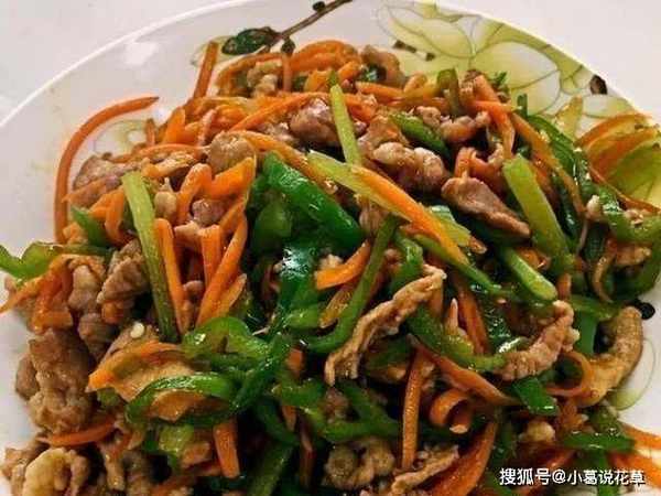 5、然後依次倒入青椒末和胡蘿卜絲,翻炒片刻,加鹽,加醬油,加入快熟的芹菜,倒入炸好的肉片,翻炒兩下,使之均勻,即可。關火上桌